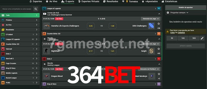 O 364Bet oferece uma grande seleção de opções de apostas em e-sports com probabilidades competitivas